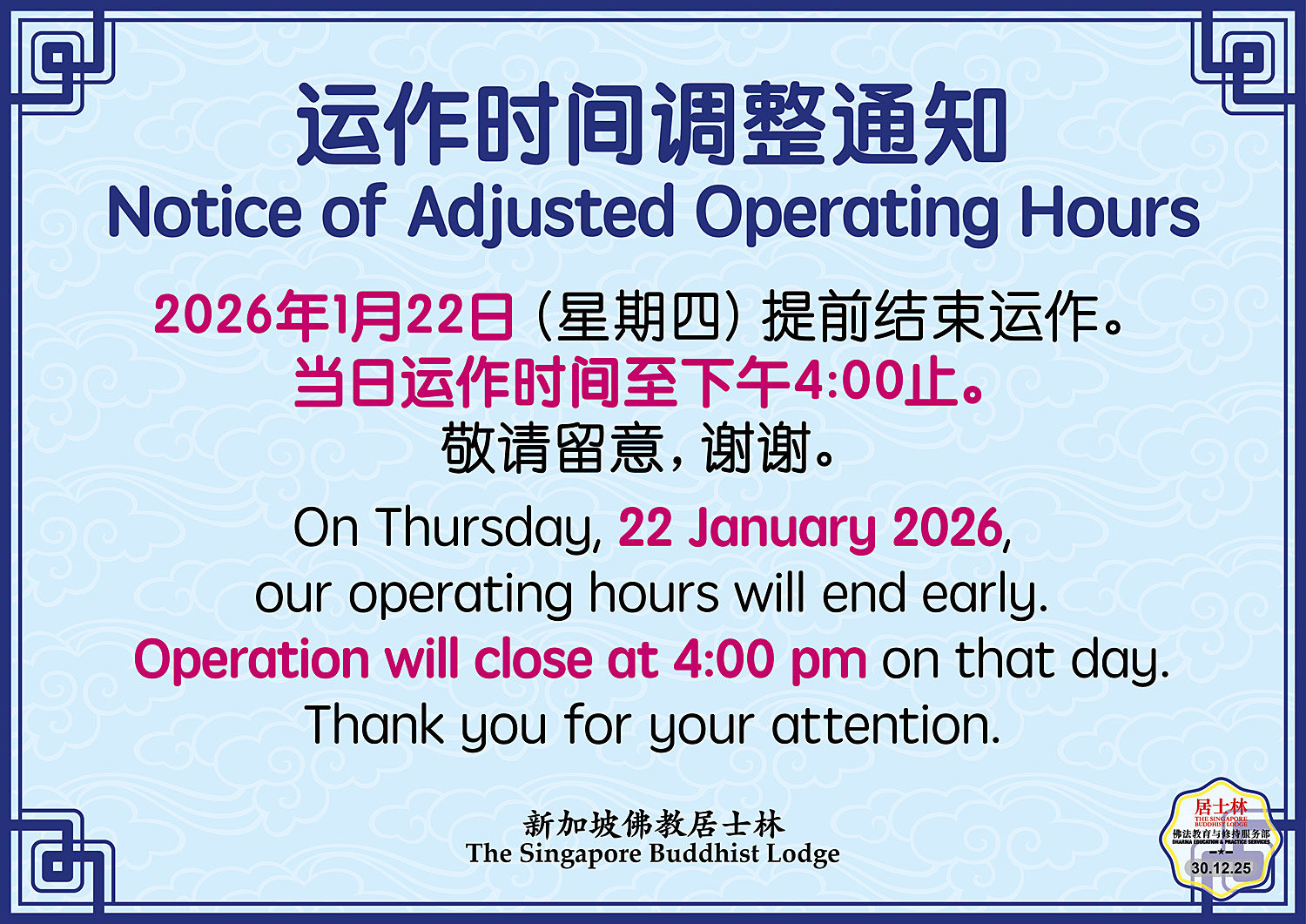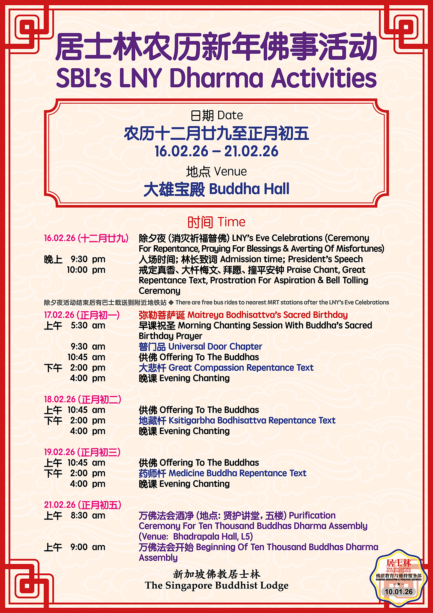 2026 除夕夜敲钟仪式 2026年01月15日 一日精进念佛 2026年01月02日 点击这里报名 普贤行愿品 2025年7月02日 点击这里报名 十方缘公开讲座 2025年12月3日 点击这里报名 妙髻儿童佛学班2026招生 2022年11月12日 点击这里报名 Bursary Application 2026 2025年12月29日 中小学助学金2026 2025年12月29日 中医义诊所看诊时间 2025年12月3日 公开讲座直播 2025年11月21日 运作时间调整通知 2025年01月02日 三皈五戒通告2026 2026年01月15日 点击这里报名 念佛堂开放时间通告 2025年1月21日 图书馆开放时间通告 / Notice for Opening Hours of Library 2024年2月23日 图书馆暂时关闭通告 / Temporary Closure of Library 2025年12月30日 义工招募启事 2021年12月15日 十方斋堂开放时间 Opening Hours of Dining Hall 2022年8月11日 网上登记及捐款 Online Registration for Dharma Assemblies & Donations 2023年7月2日 《狮城潮音》征稿启事 Call for Articles 2022年3月6日 重要通告 2022年8月11日 Important Notice 2022年8月11日